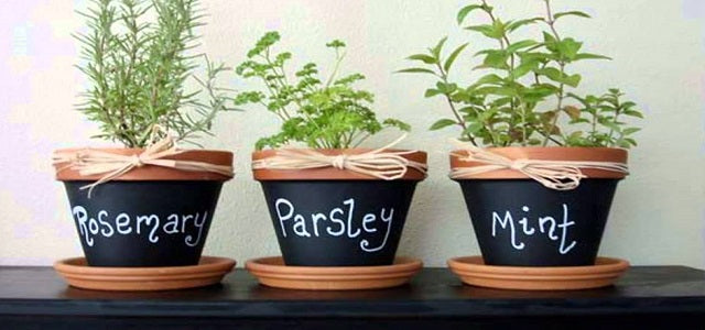 This is a really creative way to use blackboard paint. Here, little pot planters have been painted to make a really pretty display that would look fantastic on a shelf in your establishment.