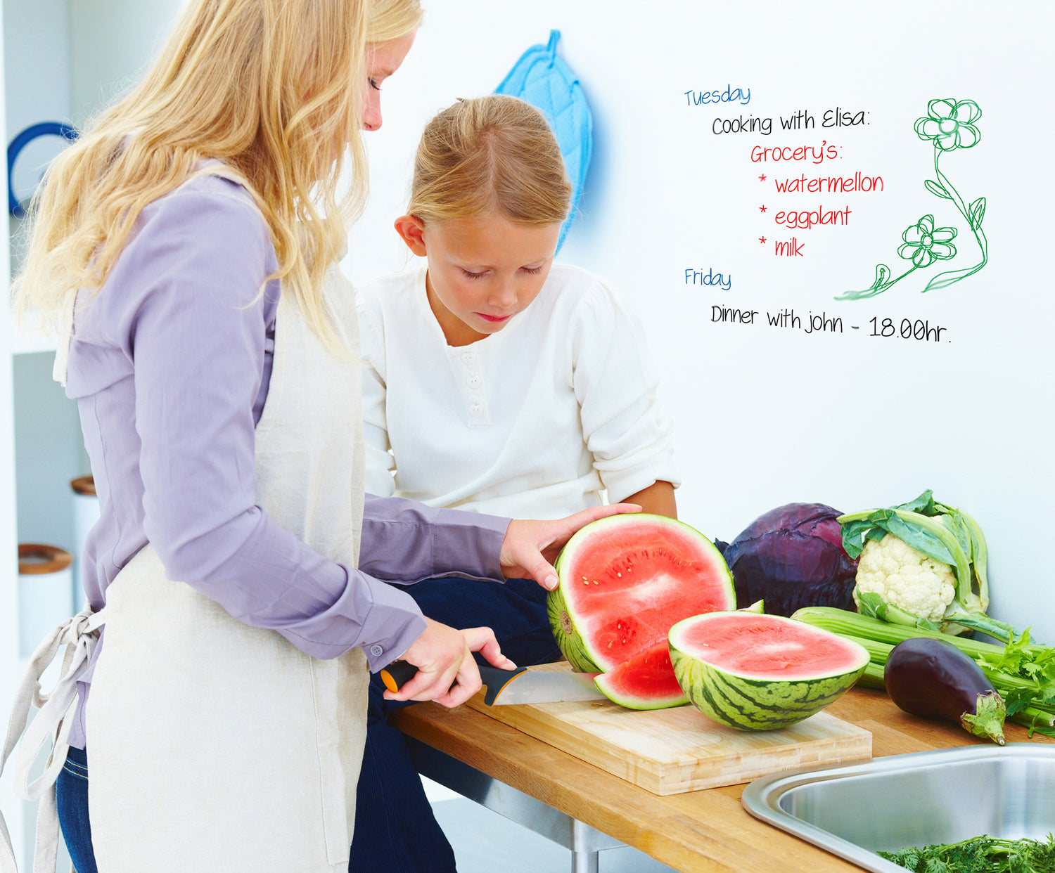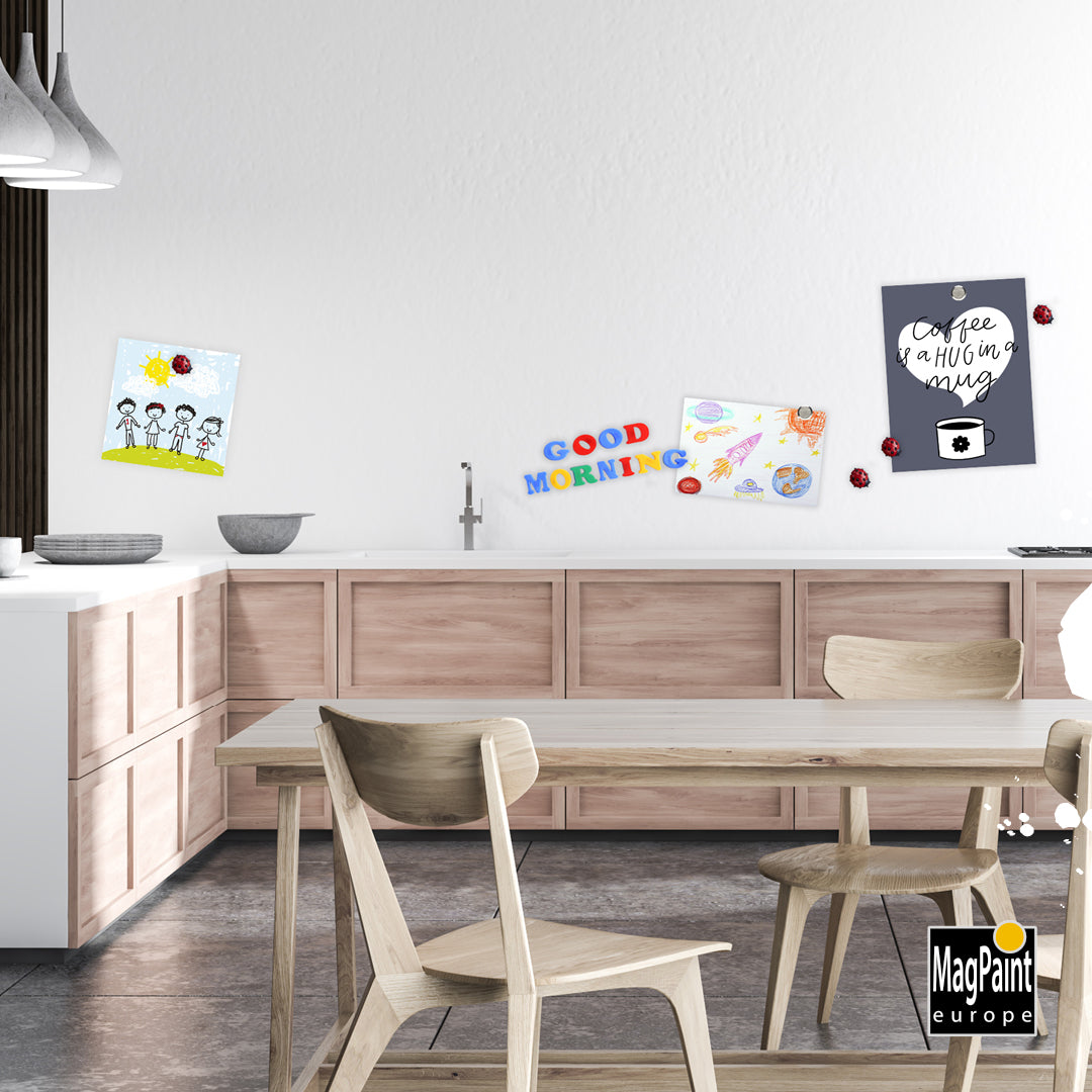 The heart of the home. Why not create a writable blackboard or whiteboard area for lists, menus and memos.Is your fridge door overflowing with drawings, invites and letters? Turn any wall into a magnetic surface to free your fridge of clutter!