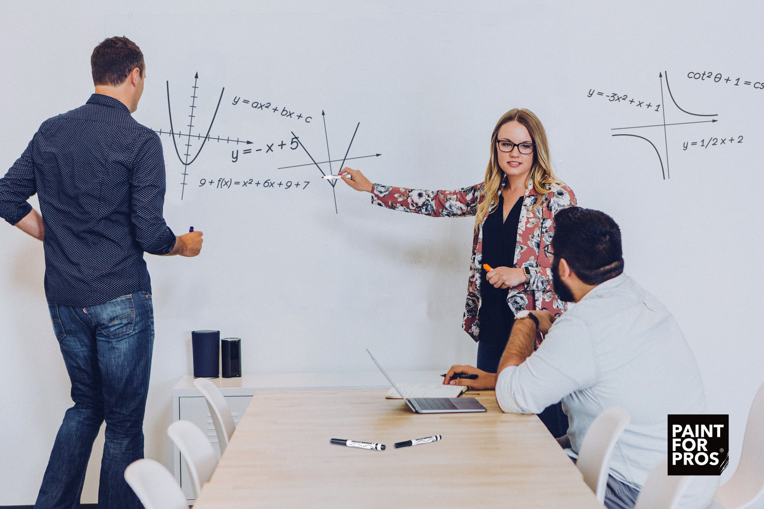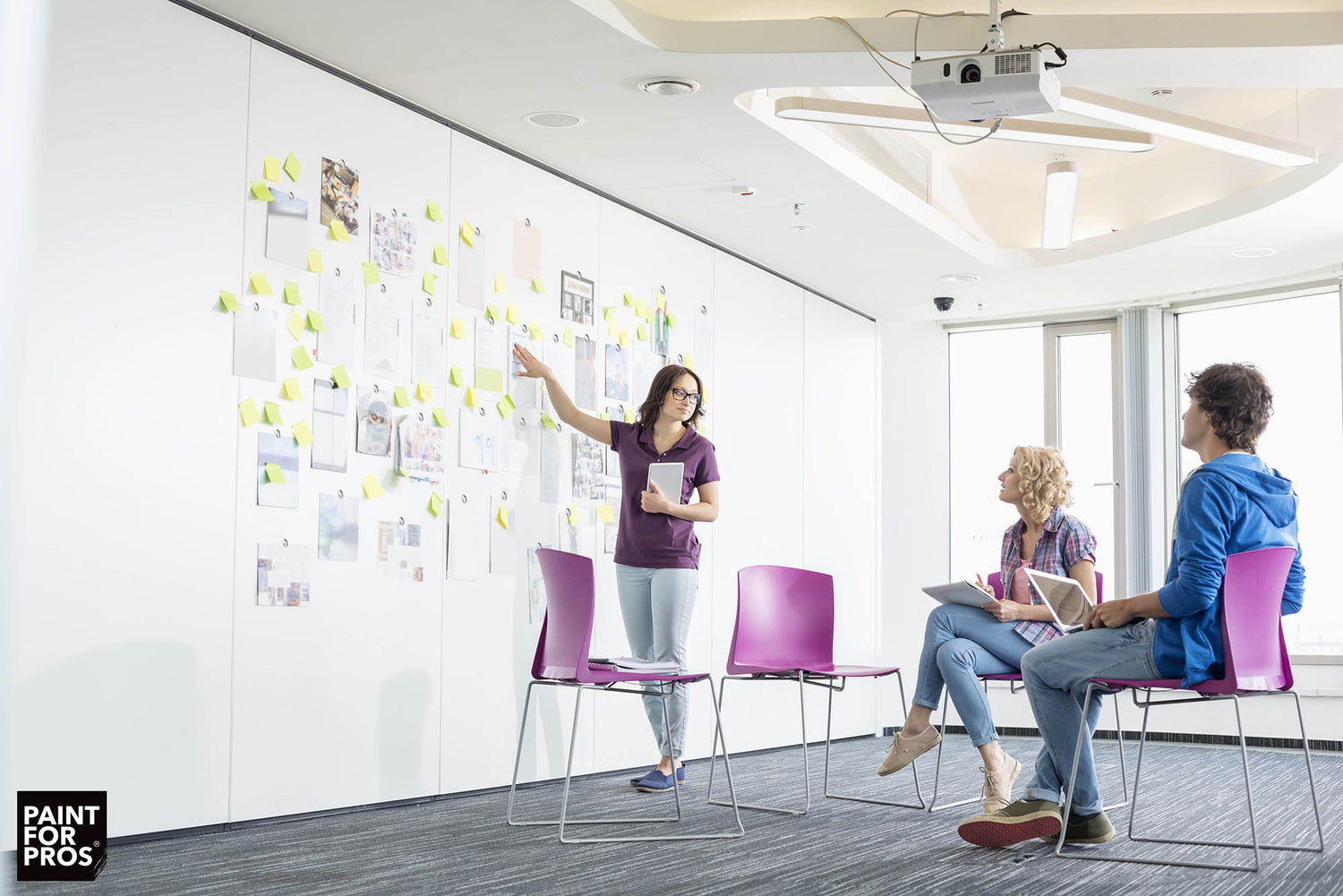 With whiteboard paint, you can choose a wall in your meeting or training room, and paint the whole area to create a floor to ceiling whiteboard for note-making, scribbling down ideas and drawing diagrams.