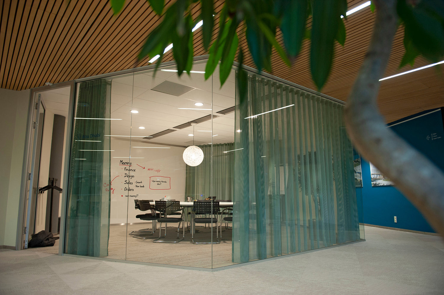 We love the use of whiteboard paint in this partitioned office. The glass walls are really cool and create a private area within an open space for an office-within-an-office.