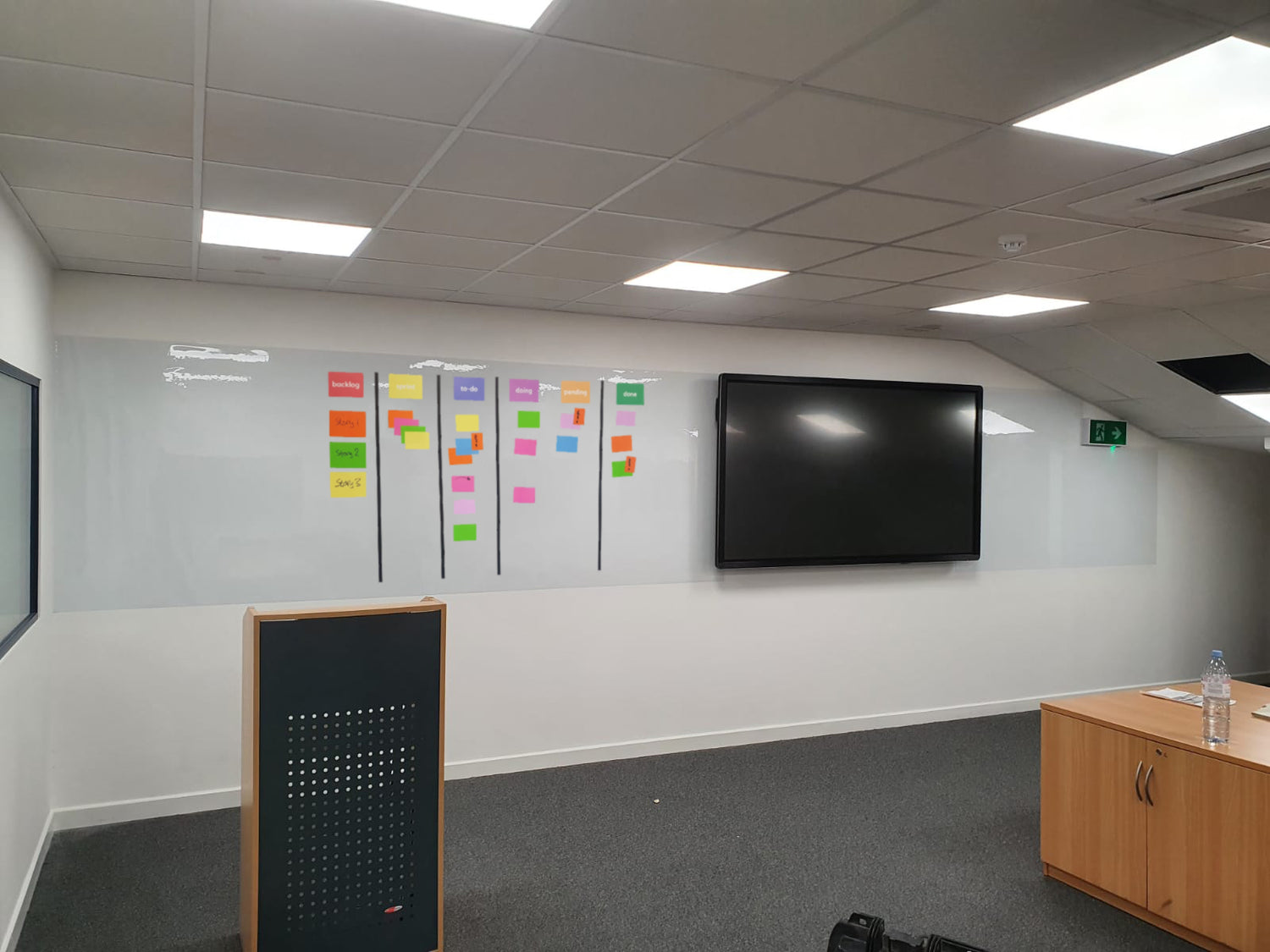 The Scrum wall serves as a visual representation of the project's progress, allowing team members to have a shared understanding of the work in progress, identify blockers or impediments, and facilitate collaboration and communication among team members. A brilliant addition to the meeting room.